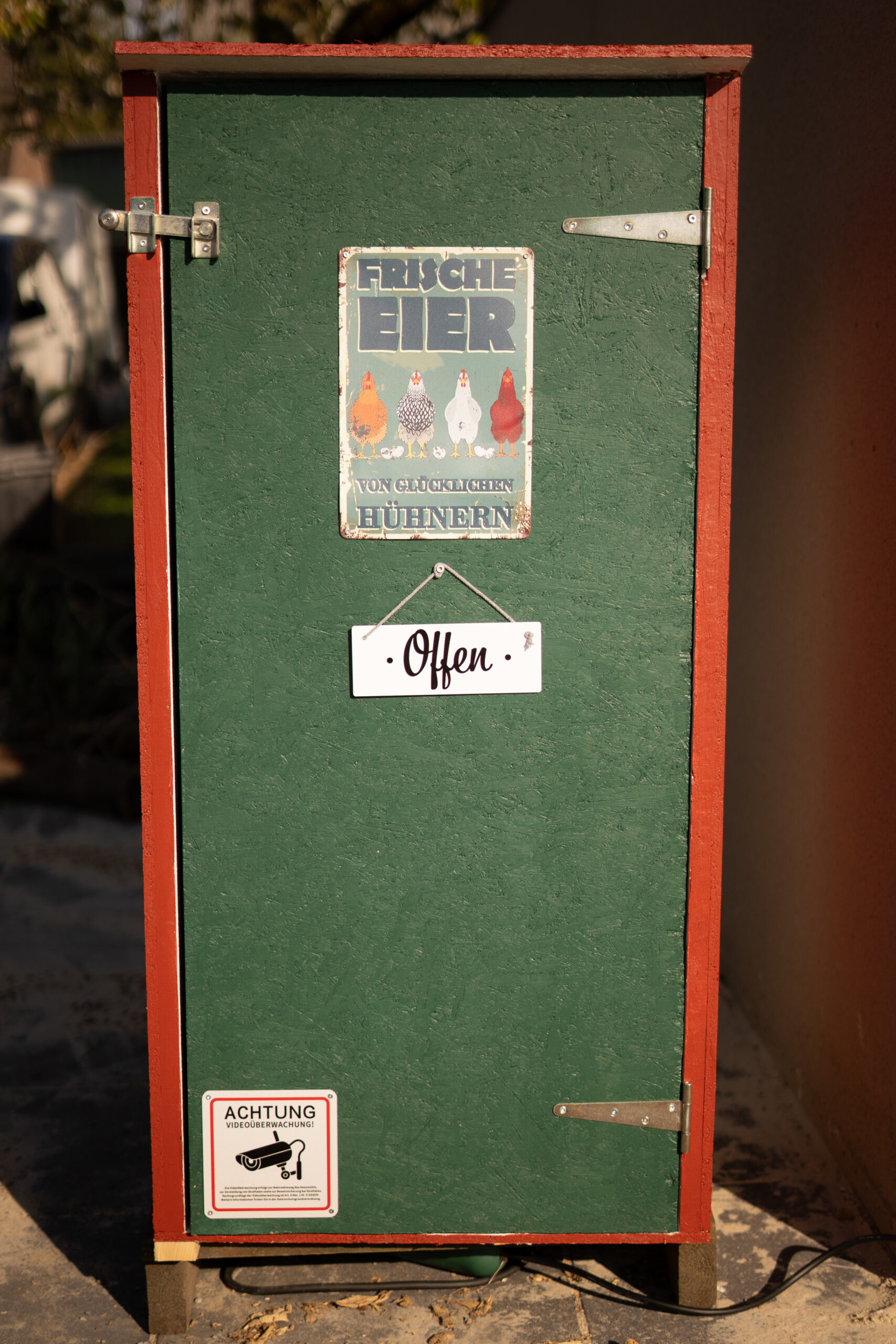Von ihrem neuesten Projekt können Sie ebenfalls profitieren, denn aus dem selbstgebauten Eierschrank können Sie rund um die Uhr die Eier unserer Hühner erwerben. Regional und frisch von Traudl-Wilmi und ihren Kumpels.